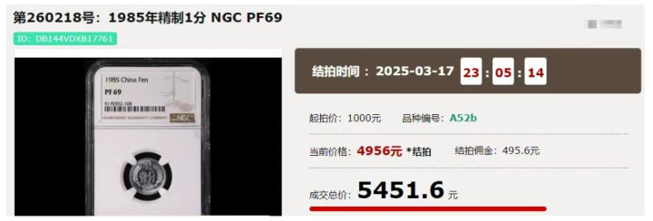 1985年的精制1分,发行量仅4825枚,全部用于装帧收藏册,从未流通过。因其数量稀少、工艺精细,存世品相普遍优良。在拍卖会上,一枚评级高达69分的精制1分,成交价达到5451元,直接把面值放大了五万多倍。